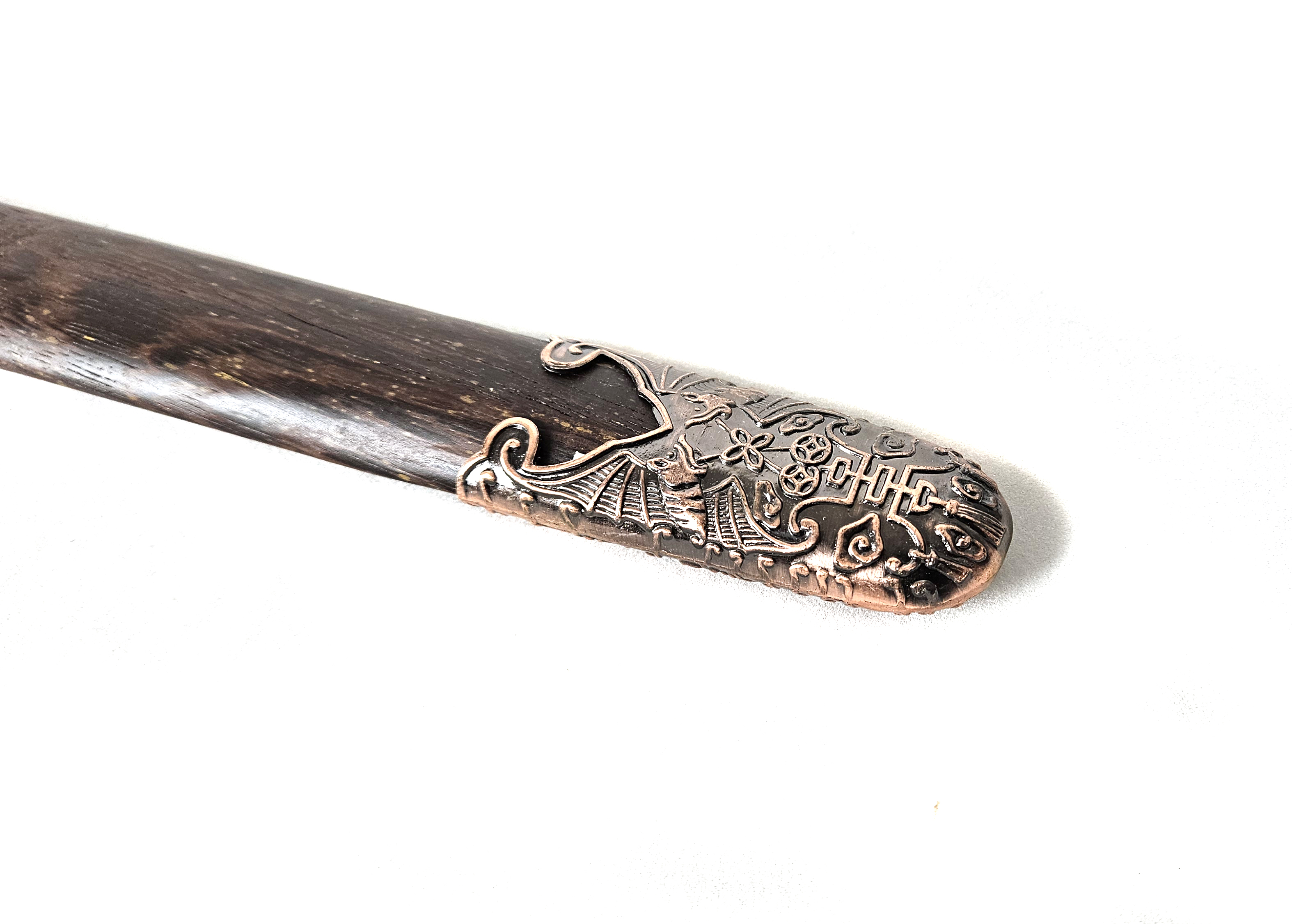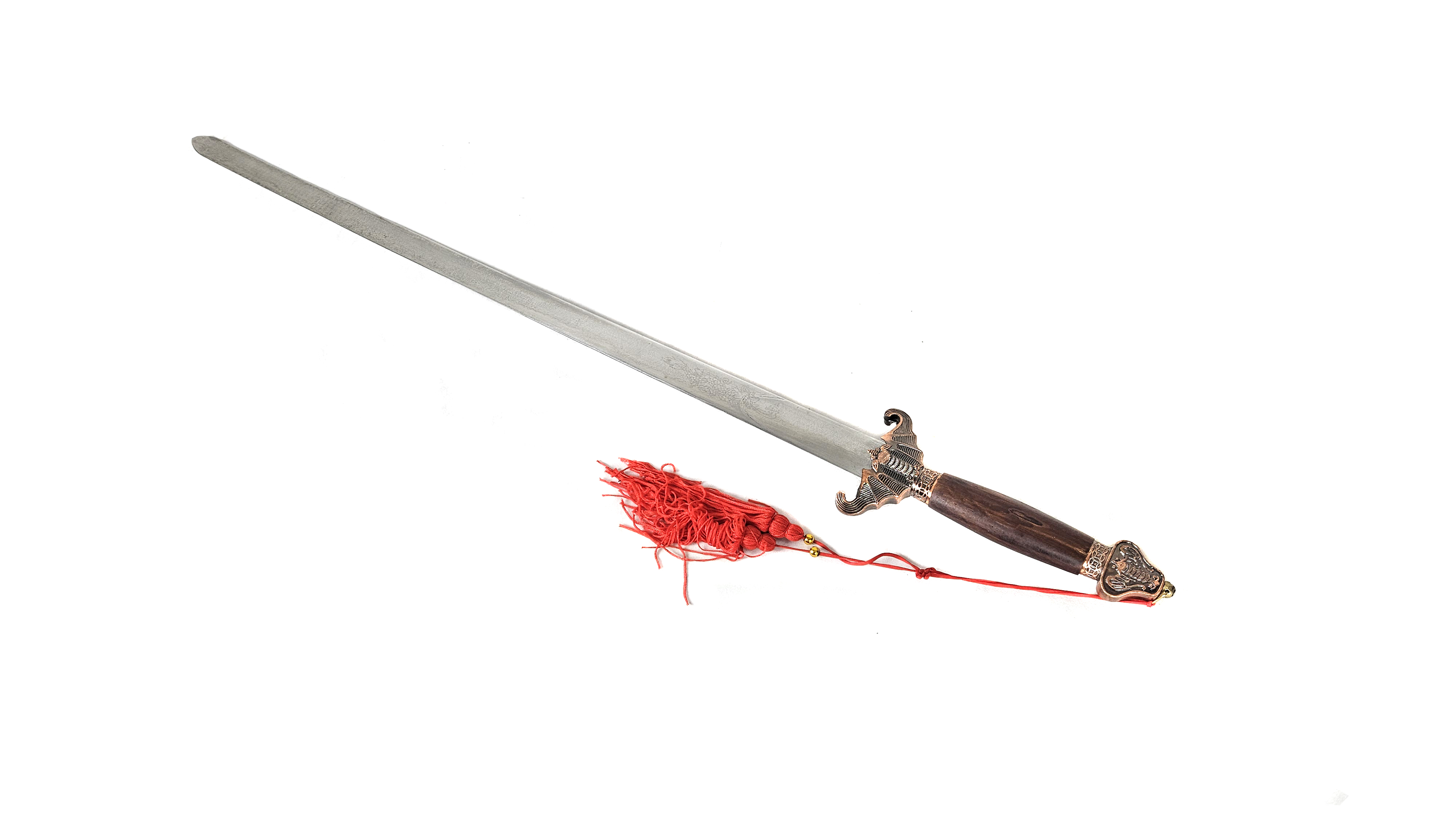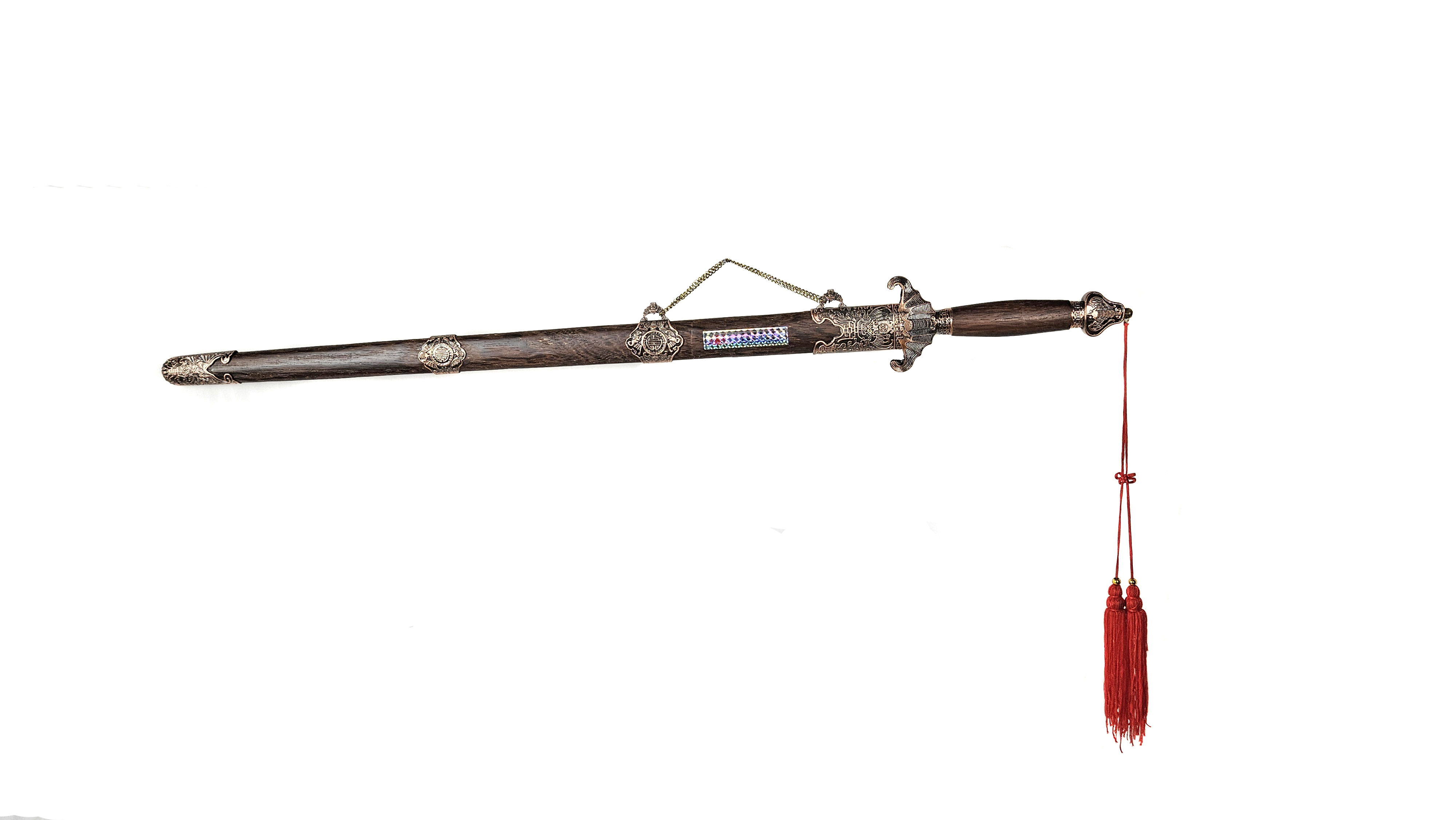 Der Griff besteht aus Holz und ist mit einem traditionell chinesischen Handschutz versehen. Am Griffende ist eine rote Quaste befestigt.