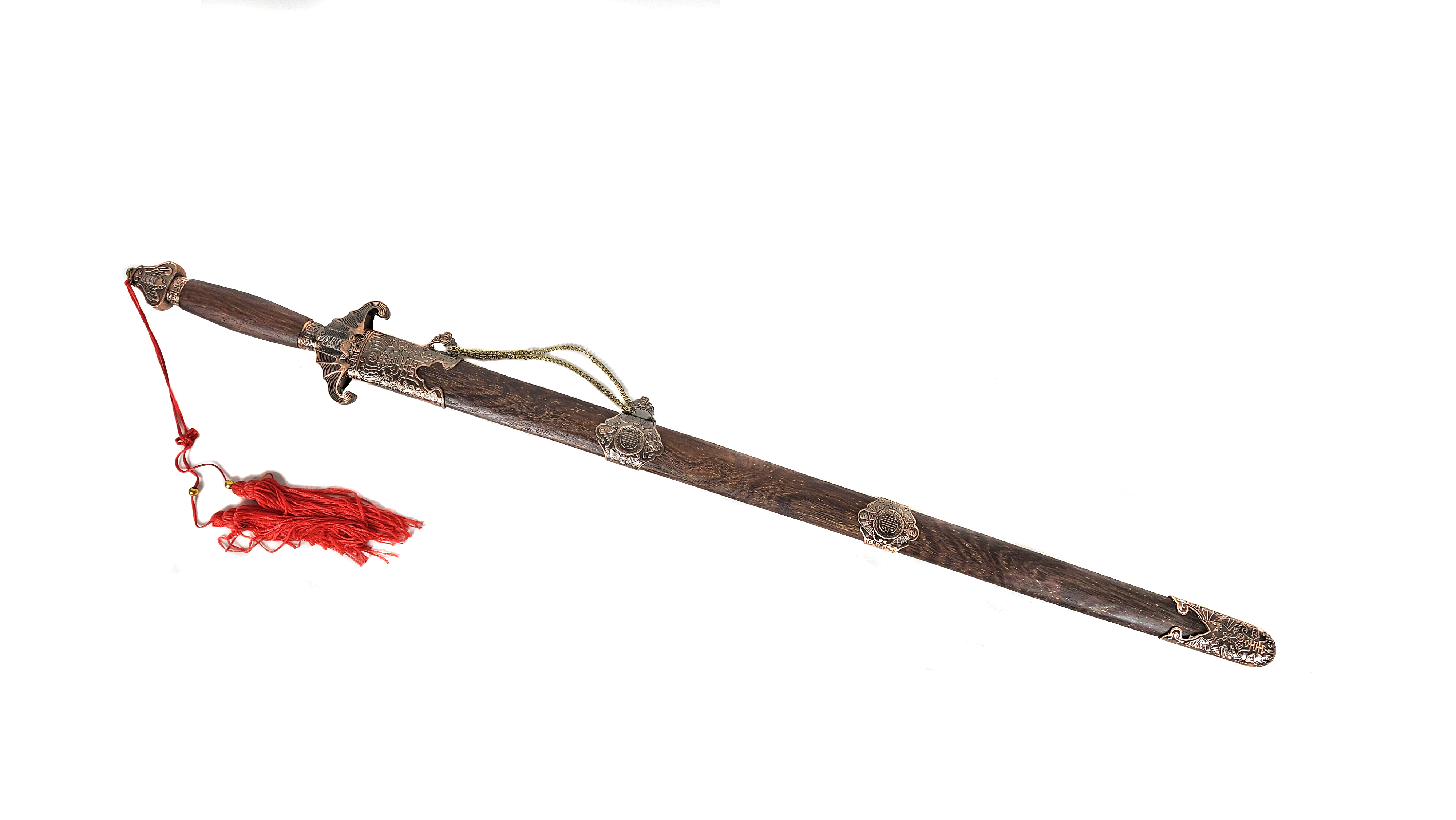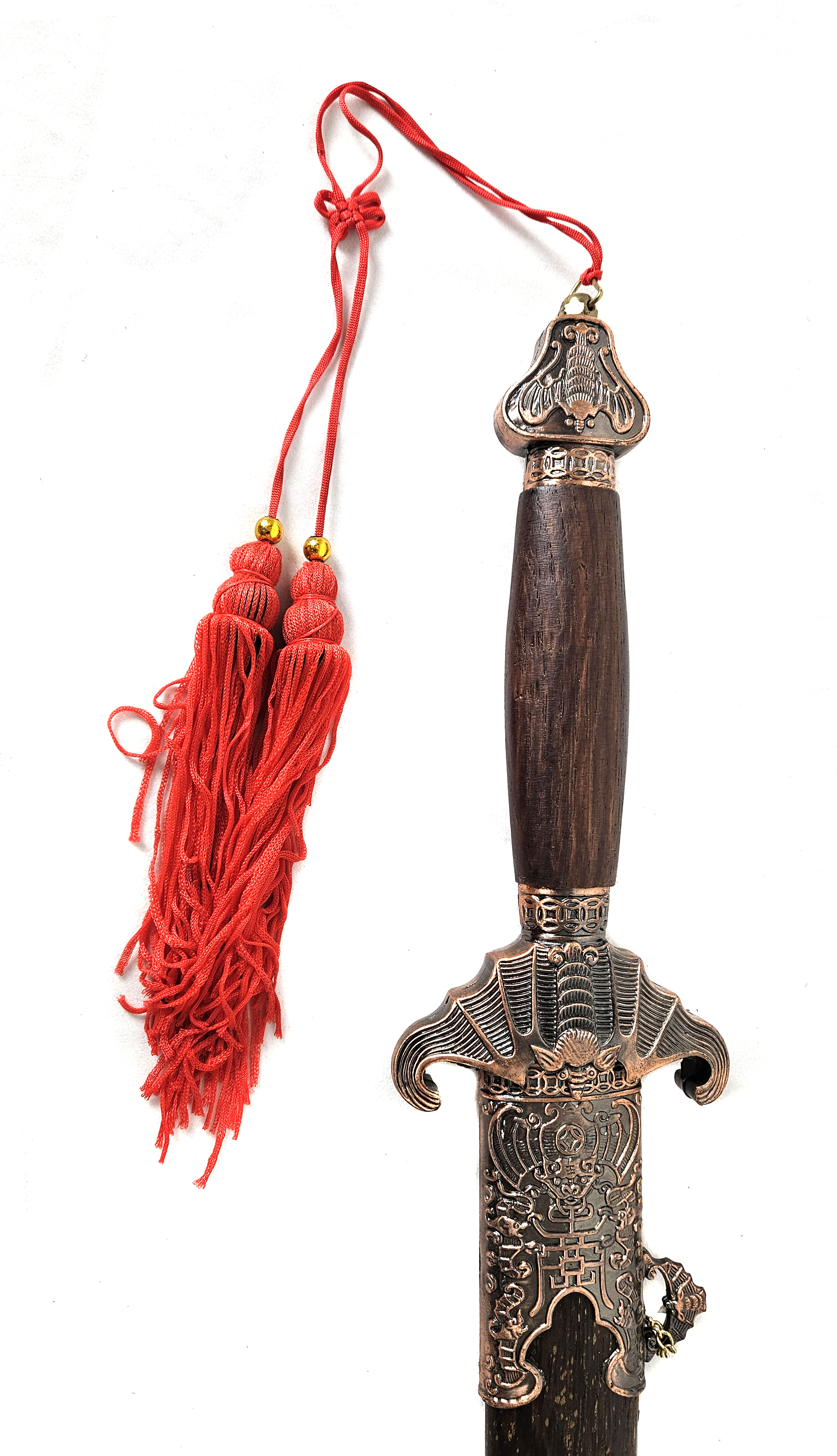 Dieses Tai Chi Schwert besitzt eine fest geschmiedete, leicht flexible Klinge und eignet sich ideal für Training und Vorführungen. Die Klinge ist stumpf und hochwertig verarbeitet. Auf beiden Seiten befinden sich ausgeprägte chinesische Schriftzeichen sowie Drachenmotive.